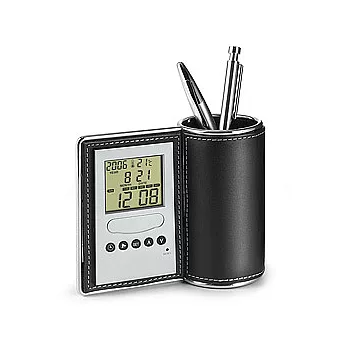 專為重視空間運用的您打造,將鬧時鐘與筆筒合而為一,另外再加掛溫度顯示、日期顯示、生日提醒、倒數計時等功能,提供您最多樣實用的設計。簡約黑色合成皮革包覆,搭配鏡亮不鏽鋼邊框,呈現簡約雅致的生活品味。內建九組不同的音樂響鈴,讓您隨心所欲轉換鬧鈴氣氛。另有生日提醒功能,在生日快樂歌的音樂聲中提醒您重要親友的生日。倒數計時功能最多可設定至23個小時又59分鐘,讓您更有效率地運用寶貴的時間。簡約外型,適合擺放任何空間,是您日常生活中最實用的選擇。內附中文使用說明書及電池一組。
